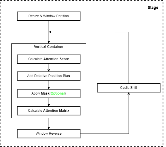 이러한 효과를 누리기 위해 각 스테이지는 쉬프트되지 않은 이미지를 분할하고 W-MSA를 진행한 뒤, SW-MSA를 위해 이미지를 다시 합쳐놓을 필요성이 있습니다. 이를 위해서 각 스테이지에서는 Window Partition→(Cyclic Shift)→Window Reverse 과정이 반복적으로 발생하는 것입니다. 또한 각 스테이지는 W-MSA 이후 cyclic shift를 통해 SW-MSA가 진행되기 때문에, 각 transformer block은 2의 배수로 적용됩니다.