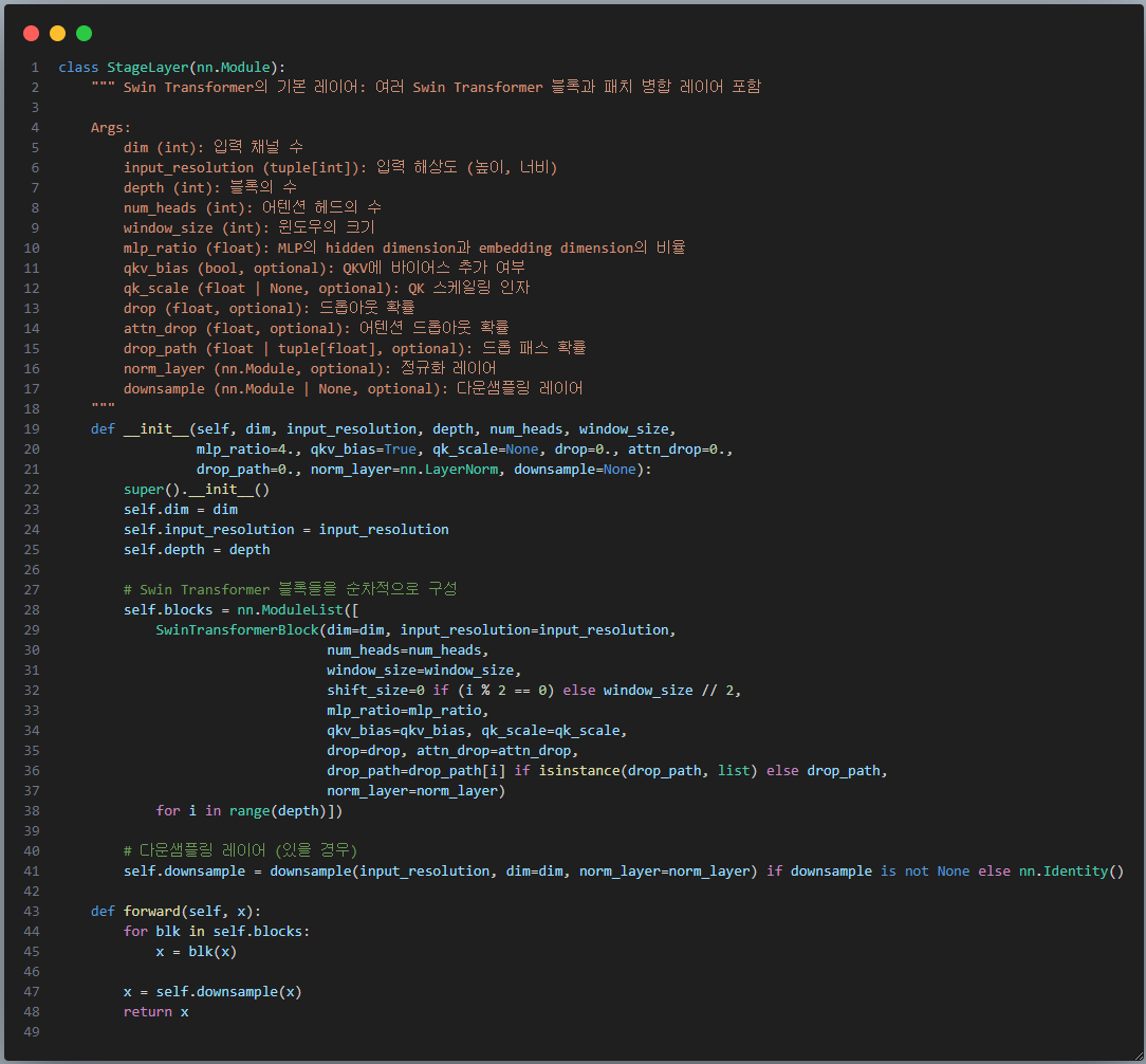 이제 모든 구성요소가 정의되었습니다. 이제 이를 이용해 스테이지 레이어를 구축한 뒤, 다시 이를 이용해 Swin Transformer 전체를 구현해보도록 하겠습니다.