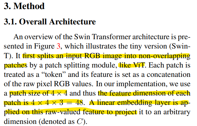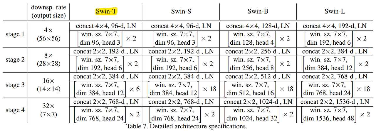 ViT의 경우, 가장 작은 모델이었던 ViT-Base가 224 사이즈의 이미지를 대상으로 16 사이즈의 패치로 분할했을 경우, 196개의 패치와 768개의 embed dim을 가졌었습니다. 반면 Swin의 경우, 가장 작은 모델인 Swin-Tiny가 96개의 채널(embed_dim)과 3,136개의 패치를 가지게 됩니다.