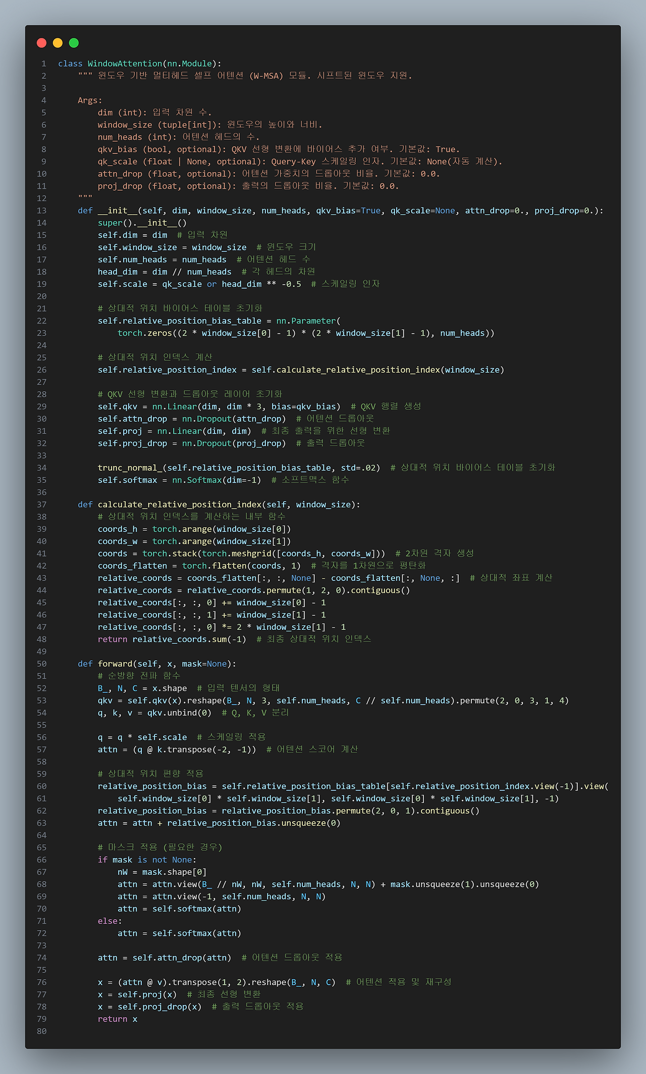 코드는 좀 길지만 복잡하진 않습니다. 하나씩 살펴보면, 이미지에 대한 q, k, v를 생성하고 스케일링을 적용하고, 상대적 위치 편향을 고려할 준비를 합니다. 그 이후에는 전달받은 mask가 있다면 적용(SW-MSA인 경우)하고, 그 외에는 그대로 Attention Score Matrix를 구성하는 식입니다. 이 과정에서 적절히 dropout 등을 넣어주고, 그 다음 Transformer Block으로 넘겨줄 수 있도록 선형변환을 진행해야 합니다.
