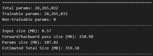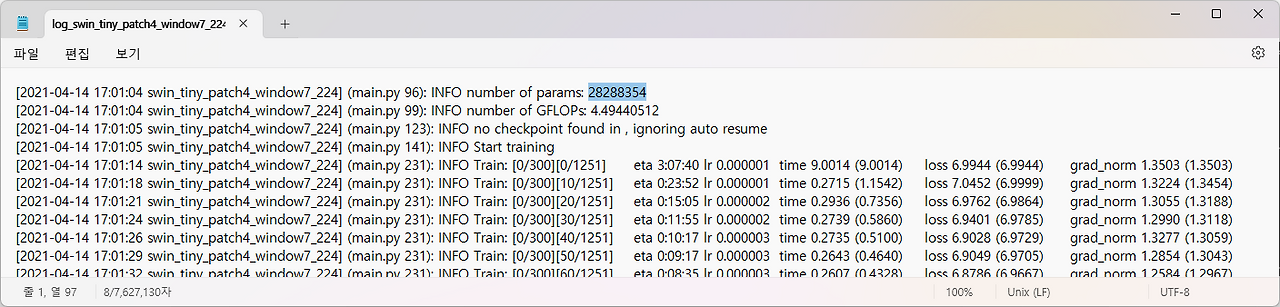 본 논문에서와 달리 공식 github에서는 28M으로 돼있고, 좀 더 구체적으로 파라미터를 확인하기 위해 github의 학습 로그를 살펴보면 아래와 같이 약 2,829만 개의 파라미터를 가지고 있어 직접 구현한 것과 다소 차이는 있지만 거의 유사한 것을 확인할 수 있습니다.