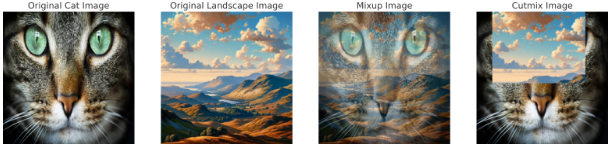 Random Augmentation은 기존에 있던 RandomCropandResize와 Random Horizontal Flip 정도로만 적용하겠습니다. Drop Path는 이미 적용돼있고, Mixup과 Cutmix는 학습 코드에 추가로 적용해야 합니다. Mixup과 Cutmix에 대한 이해를 돕기 위한 그림을 살펴보면 위와 같습니다. 이를 코드로 적용하기 위해선 아래와 같이 작성할 수 있습니다.