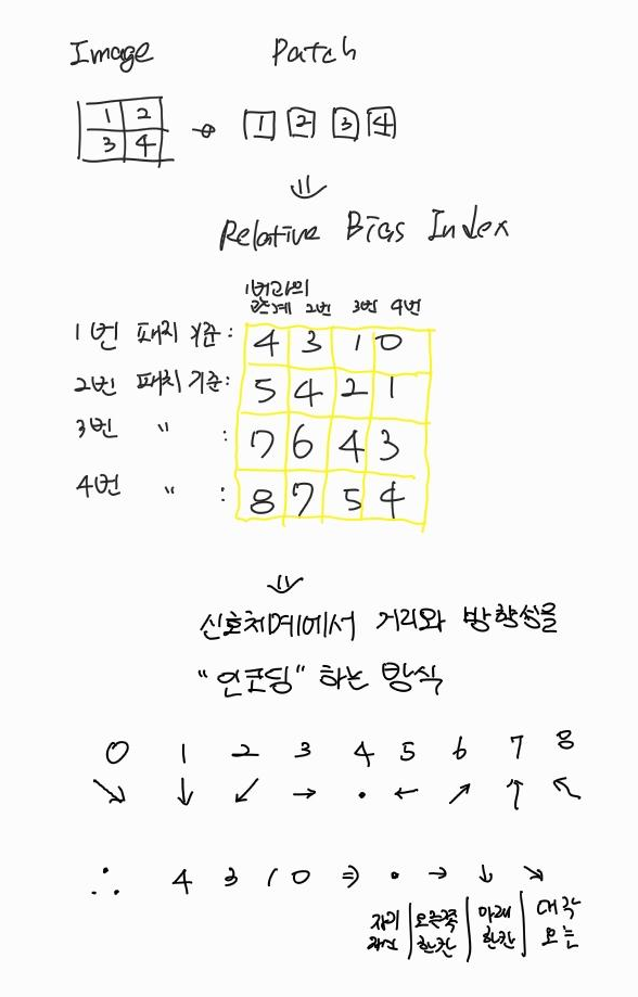 상대적 위치편향은 토큰 간의 상대적인 거리를 고려할 수 있도록 함으로써 패치 분할 혹은 윈도우 분할로 제대로 고려되지 않는 영역정보를 고려하기 위한 방법입니다. 이를 위해 패치 간 상대적인 위치 정보를 x축과 y축을 기준으로 위치행렬을 생성해 두 개의 좌표를 통해 상대적인 좌표를 구현하는 식입니다.