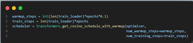 다음으로는 스케줄러인데요, 이는 이전에 구현했던 cosine warmup scheduler와 차이가 없습니다. 이미 transformer 구현과 ViT에서 직접 구현하며 그 그래프를 살펴보기도 했기에, 여기선 transformers 라이브러리를 통해 구현된 구현체를 활요하도록 하겠습니다.