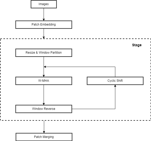다만 위 그림에서 다소 애매한 부분이 있습니다. 일반적으로 패치 분할(Patch Partition)은 단순히 이미지를 지정된 사이즈의 패치로 나누는 것을 의미합니다. 이는 단순히 이미지를 나누는 것에 불과하며 그 어떤 학습가능한 가중치가 있는 것이 아닙니다. 다만 이후 Linear Projection하는 것을 고려하면 이 과정은 이미지를 단순히 분할하는 게 아닌 패치 임베딩(Patch Embedding)을 의미하는 것입니다. 또한 패치 분할과 패치 병합은 Cyclic Shift가 구현되기 위한 전후처리 과정입니다. 때문에 이를 보다 사실적으로 표현하면 Swin의 구조는 아래와 같습니다.