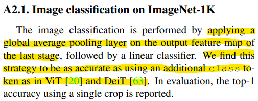 우리는 swin을 구성하면서 class token을 추가하지 않았는데요, 그 이유는 바로 여기에 있습니다. 위 그림에서 볼 수 있듯 본 논문에서는 마지막 스테이지 레이어의 결과물을 global average pooling을 적용해 class token을 대체했고, 추가적인 class token을 사용하는 것만큼의 성능을 보였다고 합니다. 이는 class token만큼의 연산을 아낌과 동시에 단순한 객체 인식 외의 태스크에도 적용가능하다는 장점이 있습니다. 때문에 우리는 이전까지 구현한 embeddings, stage layers, patch merging 클래스를 이용해 최종 피처맵의 출력을 만들고, 이에 대해 gap을 적용한 후 마지막 클래스 분류를 위한 분류기(head)를 만들어주도록 하겠습니다.