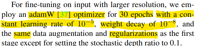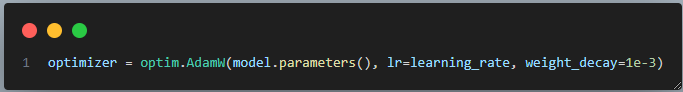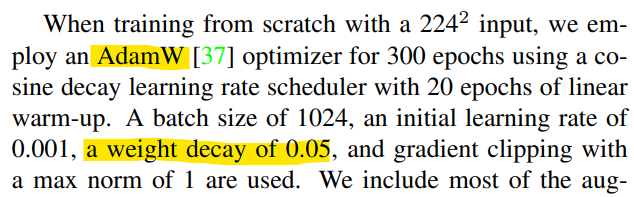 본 논문에서는 AdamW를 사용하며 0.05의 weight decay를 적용했다고 합니다. 하지만 이전의 ViT 실험에서와 마찬가지로 우리가 가진 작은 데이터셋에서는 이러한 weight decay가 부정적으로 작용하는 경우가 많았습니다. 또한 이번에도 마찬가지로 weight decay를 0.05보다는 0.01로 세팅하는 것이 최종적인 성능이 더 좋았습니다. 이는 간단히 아래와 같이 한 줄의 코드로 적용할 수 있습니다. 참고로 해당 구현체의 기본 weight decay는 0.01입니다.