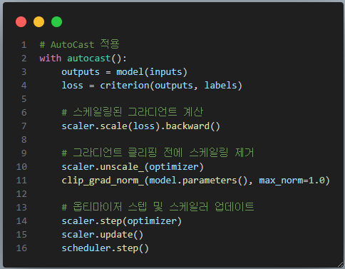 다만 우리는 이번에도 이전의 ViT에서 사용했던 것과 같이 AMP(Automatic Mixed Precision)을 적용한 학습 코드를 적용할 것인데요, 이를 통해 모델의 성능은 해치지 않으면서도 학습 효율성을 높일 수 있었습니다. 이를 위한 코드는 아래와 같습니다.