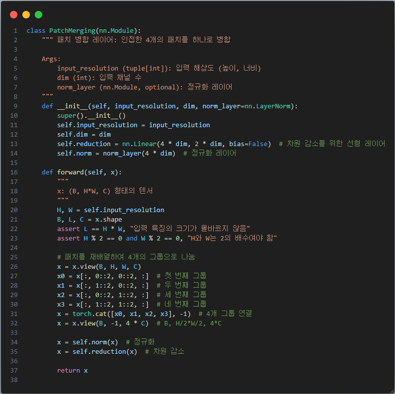 이에 대한 코드는 위와 같습니다. [row 20~23] Patch Merging을 진행하려면 입력된 이미지가 지정된 사이즈로 변형가능해야하며, 다운샘플링할 수 있는 사이즈(2의 배수)여야 합니다. 그 뒤로는 인근 네 개의 패치 그룹으로 구분하고, 이를 연결합니다. [row 32] 이를 연결하고 형상을 바꾸는 과정에서 4배로 늘어난 채널을 [row 34~35] 1/2로 줄여 4배로 늘어난 채널의 수를 2배 수준으로 조정합니다.