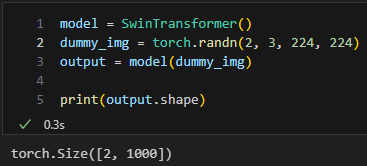 forward 부분을 살펴보면 입력된 이미지 (B, C, W, H)에 대해 embedding을 진행하고, 차례대로 Layer를 지난 뒤, layernorm, global average pooling, 그리고 classifer를 지나며 Swin Transformer가 완성됩니다. 위의 클래스의 기본값은 가장 작은 모델인 tiny를 기준으로 지정하였습니다. 이 모델의 출력결과를 살펴보면 다음과 같이 정상적으로 출력되는 것을 볼 수 있습니다.