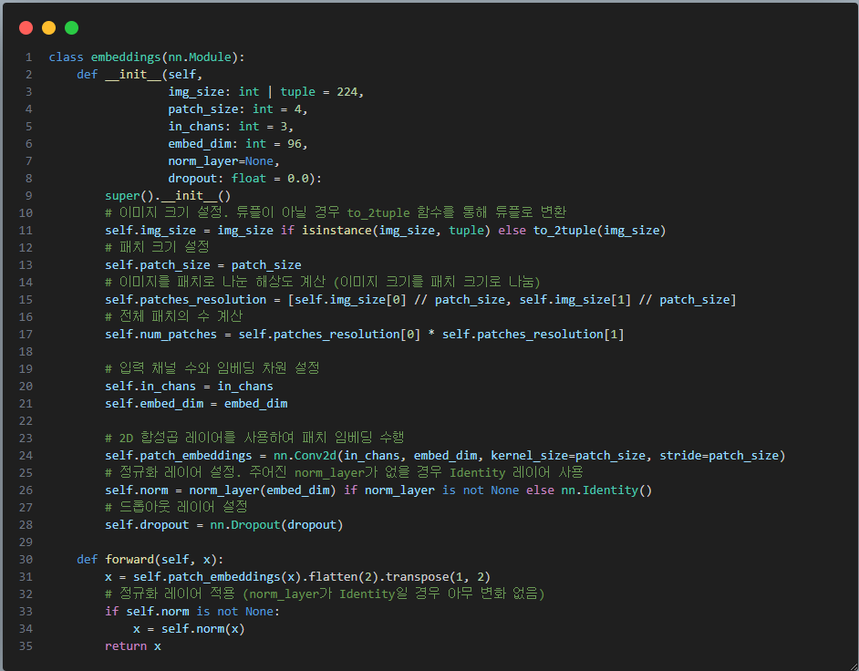 embeddings는 크게 patch embedding, layer normalization, dropout의 세 개 레이어들로 구성돼 있고, img_size는 정수형 혹은 튜플 타입으로 받을 수 있으며, 정수형으로 받을 경우, 이를 2차원 튜플로 확장하는 코드입니다.