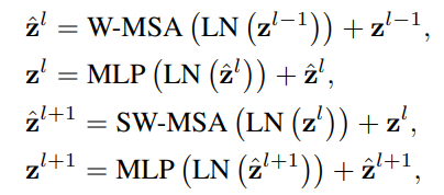 Swin의 핵심이 되는 Swin Transformer Block은 아래의 수식과 같이 구현됩니다.