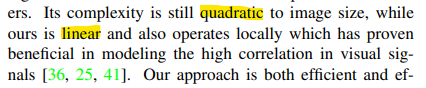 이에 대해서 본 논문에서 제시한 연산 복잡도(computational complexity)는 위와 같습니다. 왼쪽의 붉은색으로 지운 복잡도는 선형 변환을 계산하는데 필요한 연산 복잡도로, 입력과 가중치 매트릭스를 곱하는 복잡도이며, 이 부분은 ViT와 Swin가 동일합니다(코드적으로 설명하면 nn.Linear로 q, k, v를 각각 projection한 후 최종적으로 한 번 더 Linear Projection해서 총 4번의 Linear Projection이 이뤄지는 것에 대한 계산 복잡도 입니다).