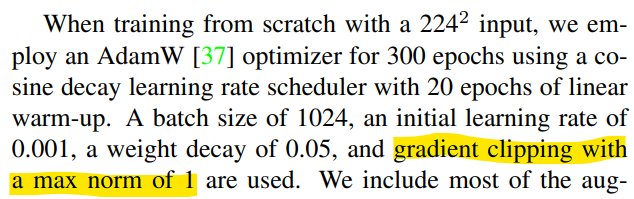 참고로 테스트 결과 gradient clipping이 적용됐을 때, 레이어의 깊이가 12인 tiny 모델의 성능은 오히려 소폭 하락했습니다. 하지만 레이어의 깊이가 24인 small은 더 높았으며, 동일한 깊이인 base나 large에서는 긍정적인 영향을 줄 것으로 보입니다. (이는 학습시킨 데이터셋에 종속적인 분석일 수 있습니다)