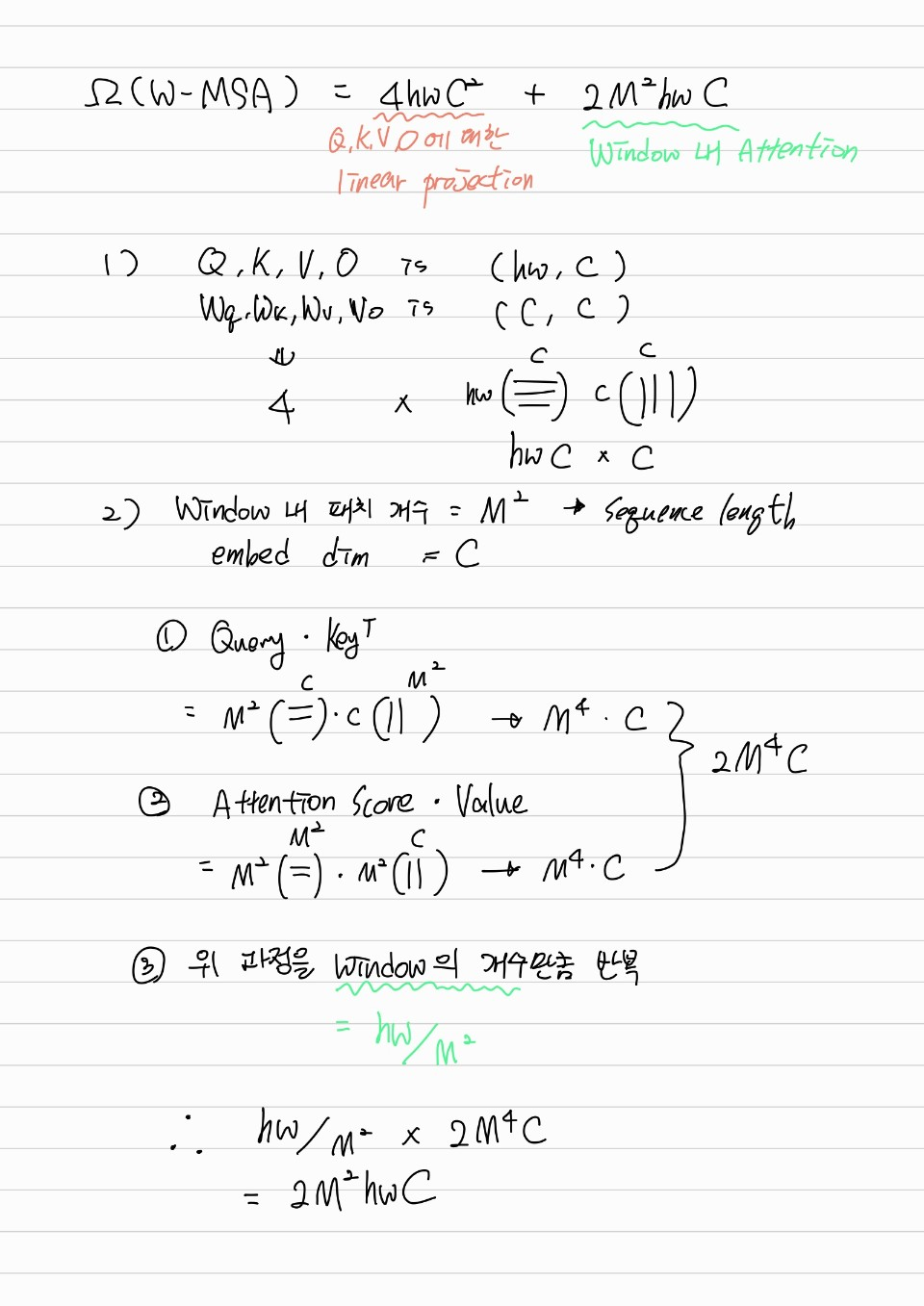 위 연산복잡도에 대한 공식 중 MSA와 관련된 사항은 여기를 참조하시고, W-MSA와 관련된 사항은 다음과 같습니다. 참고로 두 연산복잡도 계산에서 softmax에 대한 고려는 배제되었습니다.