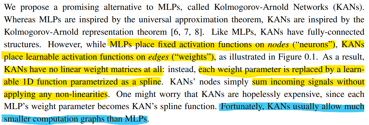 KAN 논문이나 여타 블로그 포스팅, 논문 리뷰를 종합적으로 살펴보고, 수차례 공식 코드를 검토하며 든 생각은 KAN은 단순히 어떤 구조의 모델이라기 보다는 전략적 개념에 가깝다는 것입니다. 본래의 의도는 지난 번에 리뷰한 FFN을 대체할 것으로 예상되는 MoE처럼 MLP를 특정 영역에서 대체할 수 있는 KAN을 익히고자 한 것이 본 포스팅의 시작이었는데, 실제로는 많은 문제가 있었습니다. 이를 알아보기 위해 논문의 내용에 기반해 KAN의 개념을 보다 자세히 살펴보며 진행해보도록 하겠습니다.