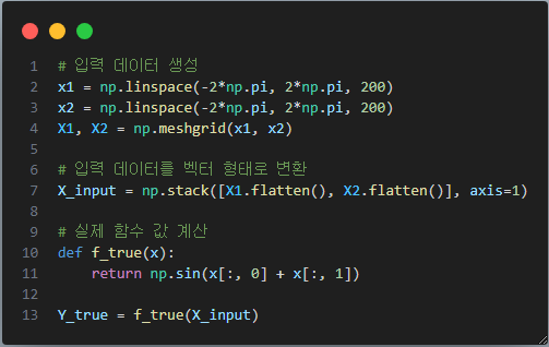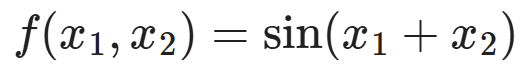 이를 간단히 구현해볼까요? x1, x2 두 개의 입력을 받는 sin 함수를 목표하고자 하는 함수로 정의하겠습니다. 이를 수식으로 나타내면 다음과 같습니다.