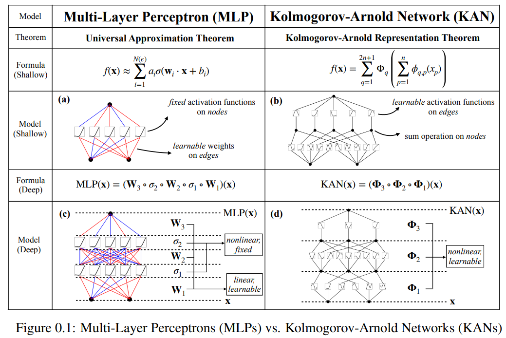 MLP는 하나의 은닉층을 갖는 인공 신경망이 임의의 연속인 다변수 함수를 근사할 수 있다는 보편 근사 정리(Universal Approximation Theorem)에 기반하지만, KAN은 임의의 연속인 다변수 함수를 복수의 일변수 함수들의 조합으로 근사할 수 있다는 콜모고로프-아놀드 표현 정리(Kolmogorov-Arnold Representation Theorum)에 기반합니다.