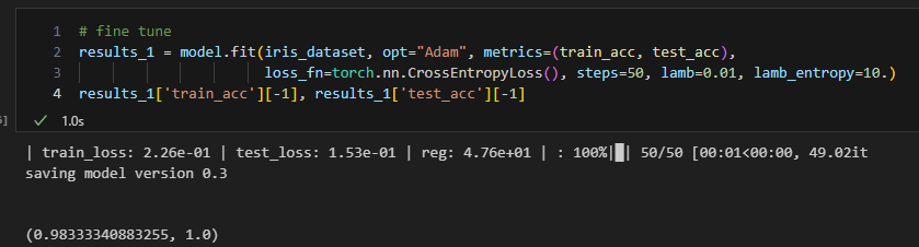 또한 이 과정에서 중요성이 낮은 활성화 함수(B-Spline 기저함수)를 가지치기함으로써 모델을 보다 강건하게 만들 수 있는 효과를 가지기도 합니다. 이러한 과정을 확인하기 위해 공식 코드를 이용해 우리에게 익숙한 iris dataset을 학습시켜 그 과정과 결과를 살펴보도록 하겠습니다.