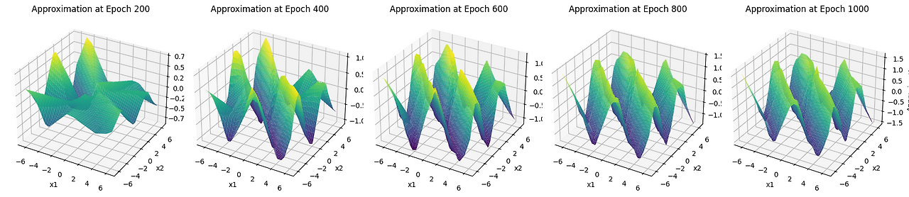 위 그림을 통해 알 수 있는 건, 간단한 함수들 간의 연산 등을 통해서 복잡한 함수에 근사할 수 있다는 것입니다. 다만 위 실험은 그저 Kolmogorov-Arnold representation theorem에 대한 실험일뿐, KAN이라고 부르긴 어려운데요. 차근차근 KAN이 되기 위한 구조를 살펴보도록 하겠습니다.