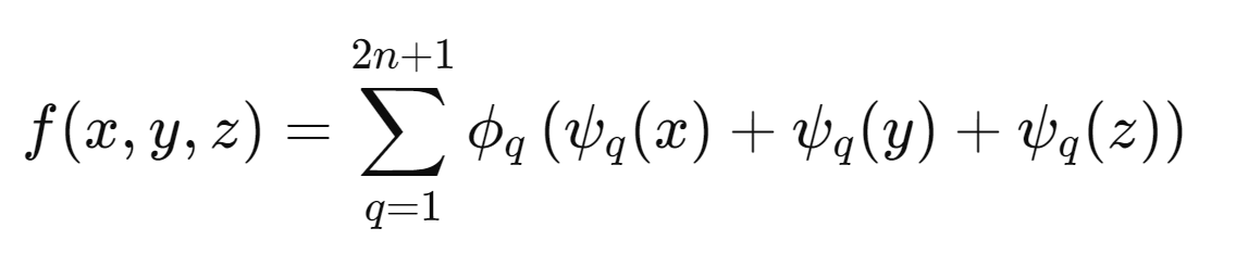 위 수식에서 ϕq와 ψq는 간단한 함수를 의미하며, 위 수식의 의미는 복잡한 함수를 여러 개의 간단한 함수로 나누어 더하고, 합쳐서 만들 수 있다는 것입니다. 이를 조금 더 전문적으로 말하면 모든 복잡한 다변수 함수를 간단한 일변수 함수들의 합으로 표현할 수 있다라고 할 수 있으며, 위 수식도 아래와 같이 정리할 수 있습니다.