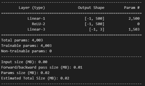 우선 약 100배 큰 MLP를 간단히 구현합니다. (4, 5, 3)이었던 KAN을 고려해 (4, 500, 3)의 MLP를 정의하며, 이를 살펴보면 다음과 같습니다.