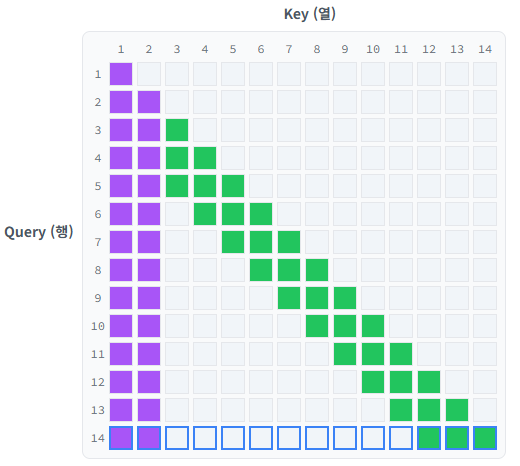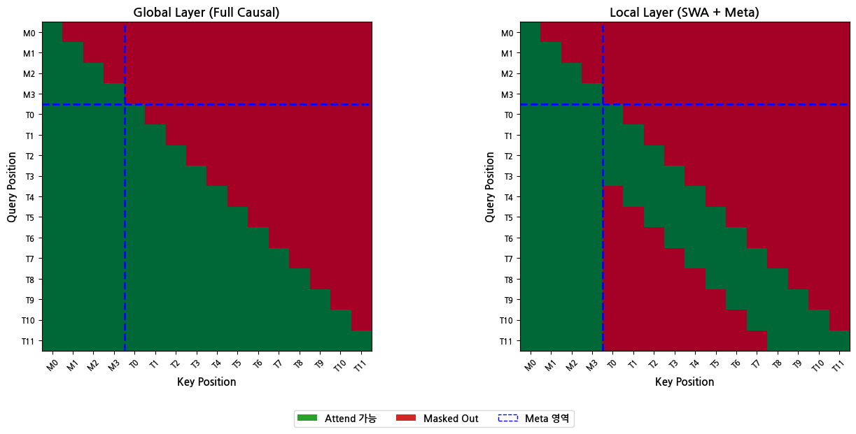 위 그림은 두 개의 메타토큰이 추가된, window size = 3의 Local Attention을 시각화한 그림입니다. 위 그림에서 알 수 있듯 모든 토큰에 대해서 보라색으로 표시된 메타토큰이 attention score 계산 대상임을 확인할 수 있으며, 현재 토큰 인덱스 이전의 것들 중 window size의 범위 내에서 attention이 이뤄지고 있는 것을 확인할 수 있습니다.
