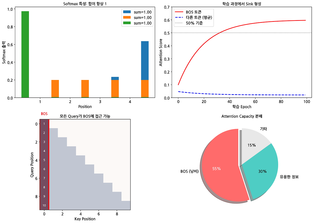 참고로 이러한 문제는 합이 항상 1이 된다는 softmax의 특징과 attention이 가진 causal mask의 특성상 앞부분의 토큰은 항상 참조하도록 하며 가장 많이 노출되기 때문에 발생하는 문제이며, 이는 다음 그림과 같이 학습이 길어질수록 심화됩니다.