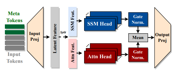 가장 핵심은 당연히 위 그림에서도 볼 수 있듯 SSM과 Attention을 병렬로 연결해 Hybrid Head를 구성한다는 것입니다. 이전에도 Zamba[3]와 같이 mamba와 transformer 구조를 혼합해 사용하는 방식은 존재했습니다. 하지만 기존에는 두 개의 모델을 직렬로 연결함으로써, mamba가 가진 고질적 문제인 정보의 압축 과정에서 발생하는 정보 손실 문제가 transformer로 이어지는 문제가 있었습니다.