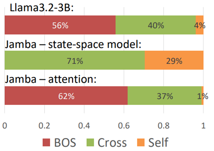 즉, 큰 의미가 없는 토큰에 attention score를 낭비하는 문제가 발생하고 있고 이는 모델의 성능이 온전하게 발휘되지 못하는 문제를 야기하는데요, 아래 그림에서 확인할 수 있듯 현대 Transformer 구조라 칭해지는 Llama에서는 56%가, 2024년 기준 가장 일반적으로 사용되는 Foundation Model Structure 중 하나인 Jamba(attention과 mamba를 직렬로 연결한 hybrid 구조)에서의 attention에서는 무려 62%의 attention score가 할당된 것을 아래 그림을 통해 확인할 수 있습니다.