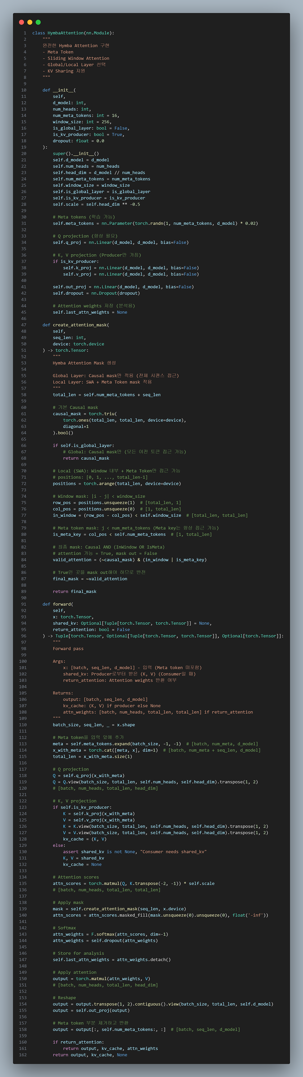 그리고 추가적으로 Meta Token의 추가 등으로 인해 더욱 심화된 Transformer의 고질적인 문제를 해결하기 위해 크게 세 가지 대안이 추가되기도 하는데요, 각각 'Meta Token', ' Hybrid Attention', 그리고 'KV Cache sharing'입니다. 이를 단계적으로 설명한 후, 코드로 구현해 그 성능을 살펴보도록 하겠습니다.