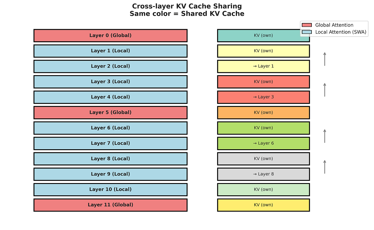 다음으로는 KV Cache Sharing(정확히는 'Cross-layer KV Cache Sharing'이 본 논문에서의 명칭)입니다. 이는 간단히 말해 Local Attention이 적용되는 모든 레이어마다 별도의 KV Cache를 생성해 활용하는 기존의 방식 대신 두 개 이상의 레이어마다 하나의 Cache를 활용하는 방법입니다. 이를 시각화해 나타내면 다음과 같습니다.