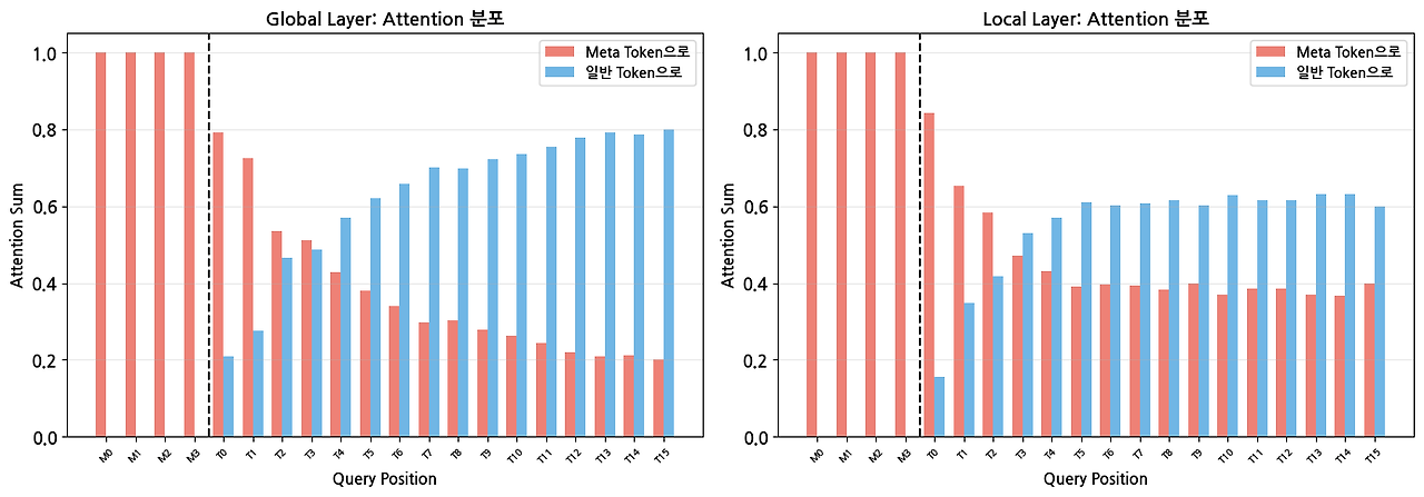 위 그림에서 볼 수 있듯이, 세 개의 메타 토큰이 <BOS> 토큰 앞에 추가되었습니다. 즉, 제일 앞에 있다는 이유만으로 <BOS> 토큰에 집중되던 attention score를 메타 토큰에 집중시킬 수 있게 되었는데요. 이는 몇 가지 장점이 있습니다.
