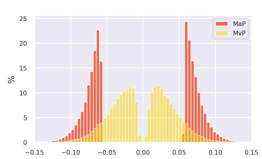 이는 위 그림과 같이 사전훈련에서의 가중치가 큰 영향을 미쳤던 절대값 가지치기와 달리 이동 가지치기의 경우 사전훈련의 영향을 줄여 전 영역에서 고르게 가지치기가 가능하다. 이를 가중치 분포를 통해 살펴보면 아래 그림과 같다.