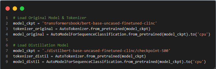 우선 지난 세 번째 포스팅 과정에서 다뤘던 모델들을 불러오도록 하겠습니다. 정확히는 Original Bert 모델을 clinc 데이터셋(의도분류)에 대해 파인튜닝한 것과 이 모델을 지식정제한 모델입니다. 다음의 코드를 통해 Original Bert는 Huggingface Hub에서, 지식정제한 모델은 로컬에서 가져옵니다.
