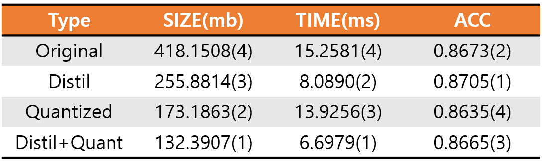 지식정제한 모델의 결과입니다. 사이즈는 256mb, 평균 실행속도는 8.09ms, 정확도 성능은 0.8705입니다. 모든 측면에서 원본 모델보다 뛰어난 결과입니다.