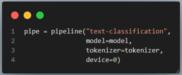 우선 기존의 transformers 라이브러리를 통해 pipeline을 구축했다면 다음과 같이 pipeline 메서드를 사용할 때, device 매개변수를 추가해주면 됩니다. 이때 device 넘버에 따라 0 이상의 숫자를 적으면 되며, -1은 cpu, 복수의 gpu를 사용할 땐 별도의 추가작업이 필요합니다.