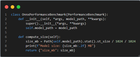 Benchmark 또한 조금 변경을 해줘야 합니다. 기존에는 torch base model이었기 때문에, torch.save 메서드를 이용해 모델을 저장한 다음 모델 사이즈를 읽어들이고, 삭제하는 과정을 거쳤습니다. 하지만 여기선 이미 모델이 저장되어 있기 때문에 모델의 경로에 따른 사이즈를 측정하도록 업데이트해주면 됩니다.