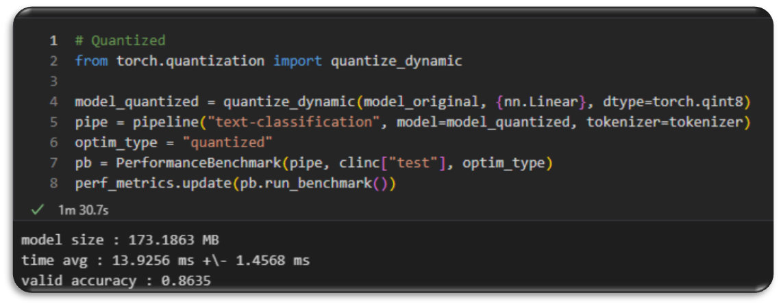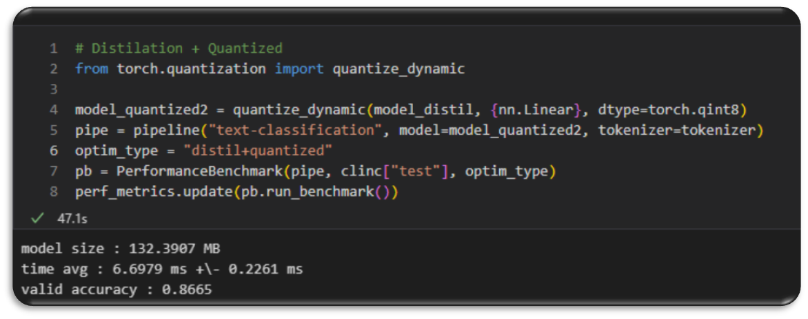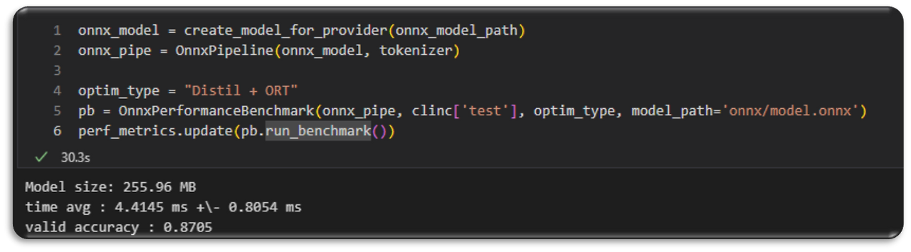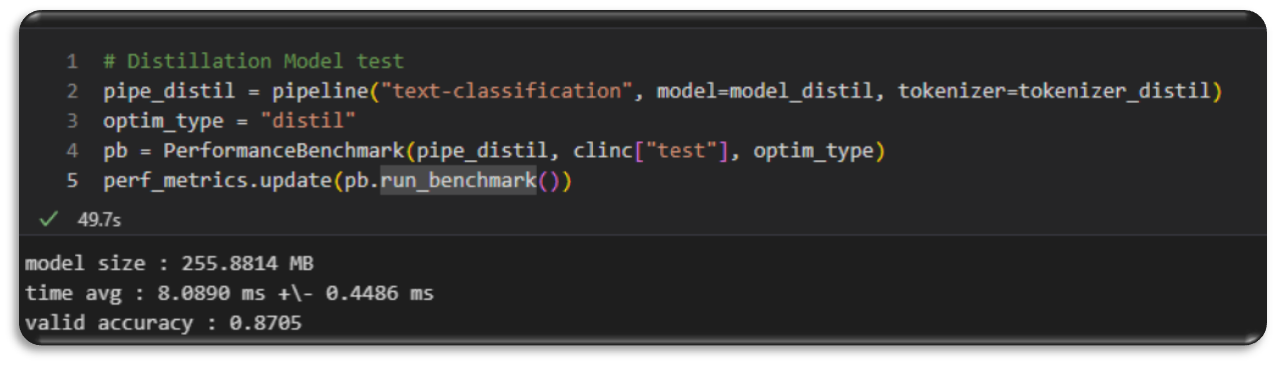 이렇게 불러온 코드를 transformers 라이브러리를 이용해 text-classification task에 대한 pipeline을 구축합니다. 각각 original과 distil이라는 이름으로 정의해준 뒤, benchmark를 확인해보도록 하겠습니다. 사용하는 benchmark는 최적화 기법의 첫 번째와 세 번째 포스팅에서 사용한 것과 동일한 클래스입니다. 평가 데이터셋으로는 학습 과정에서 사용되지 않은 clinc dataset의 test셋을 사용합니다.