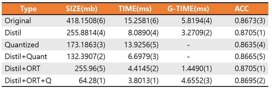 결과적으로 지식정제한 모델을 ONNX RunTime을 적용해, 양자화한 모델이 대부분의 지표에 있어 가장 우수했습니다. 정확도 성능 또한 2위이긴 하지만, 본래 모델의 성능이었던 0.8673보다도 높은 성능을 보이고 있기에 만족할만한 수준입니다.
