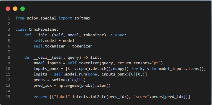기존에는 transformers 라이브러리의 pipeline 모듈을 이용해 text-classification task에 대한 파이프라인을 자동으로 구축했습니다. 하지만 당연하게도 해당 기능은 onnx와 호환되지 않기 때문에 해당 모듈의 필요한 기능만을 위 코드를 통해 구현했습니다.