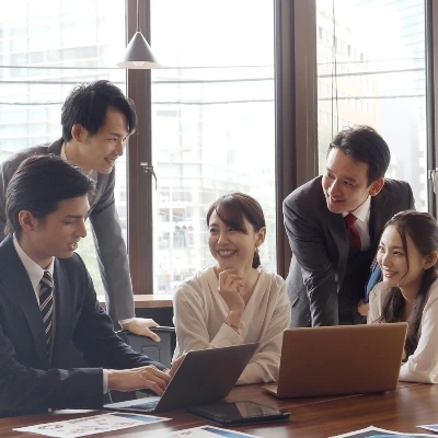 � 회의 중, 팀원의 의견을 경청하며 고개를 끄덕이고 자연스럽게 미소를 짓는 리더
