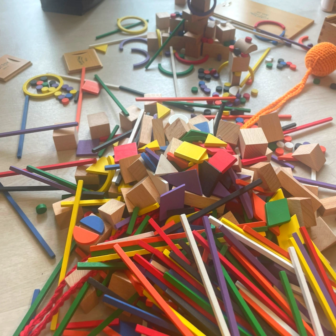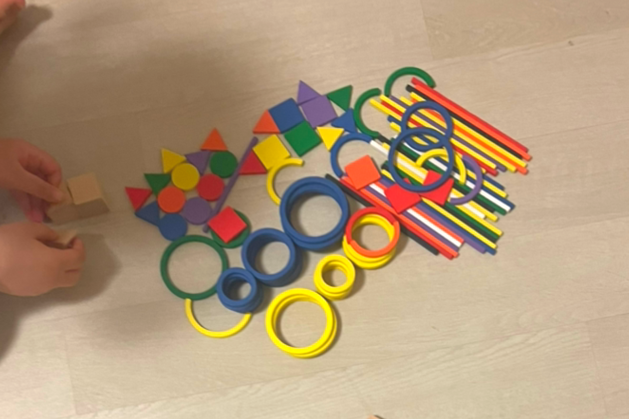 이런 관점으로 보면, 무엇을 만든 건지 알 수 없는 아이의 창작물을 새롭게 해석할 수 있습니다. 아래는 제 아이가 5살 때 가베로 만든 형태인데, 직선과 곡선의 기하학적 모양들이 한데 어우러져 있는 모양새입니다. 오른쪽 상단에 모여 있는 강력한 직선 다발들이 대각선 아래를 향하면서 운동감을 만들어 내는데, 이것은 차가운 성질(수평선)과 따뜻한 성질(수직선)이 결합되어 역동적인 에너지를 느낄 수 있게 되어 있죠. 칸딘스키에게 곡선, 특히 원은 '자신에게로 되돌아온 선'으로, 가장 안정적이고 정신적인 형태입니다. 중앙과 하단을 지배하는 파랑, 노랑, 빨강 고리들은 곡선이자 원으로 화면에 평온함, 그리고 무한함을 부여하면서 역동적인 직선들과 긴장관계를 형성합니다. 전체적으로 이 작업은 무질서한 에너지와 막 생겨나는 질서 감각이 대조와 균형을 이루며 전체적으로 역동적이고 리드미컬한 구성을 보입니다. 아이는 의식하지 않았겠지만, 이러한 대조가 만들어내는 미학적 원리를 본능적으로 활용한 셈입니다.