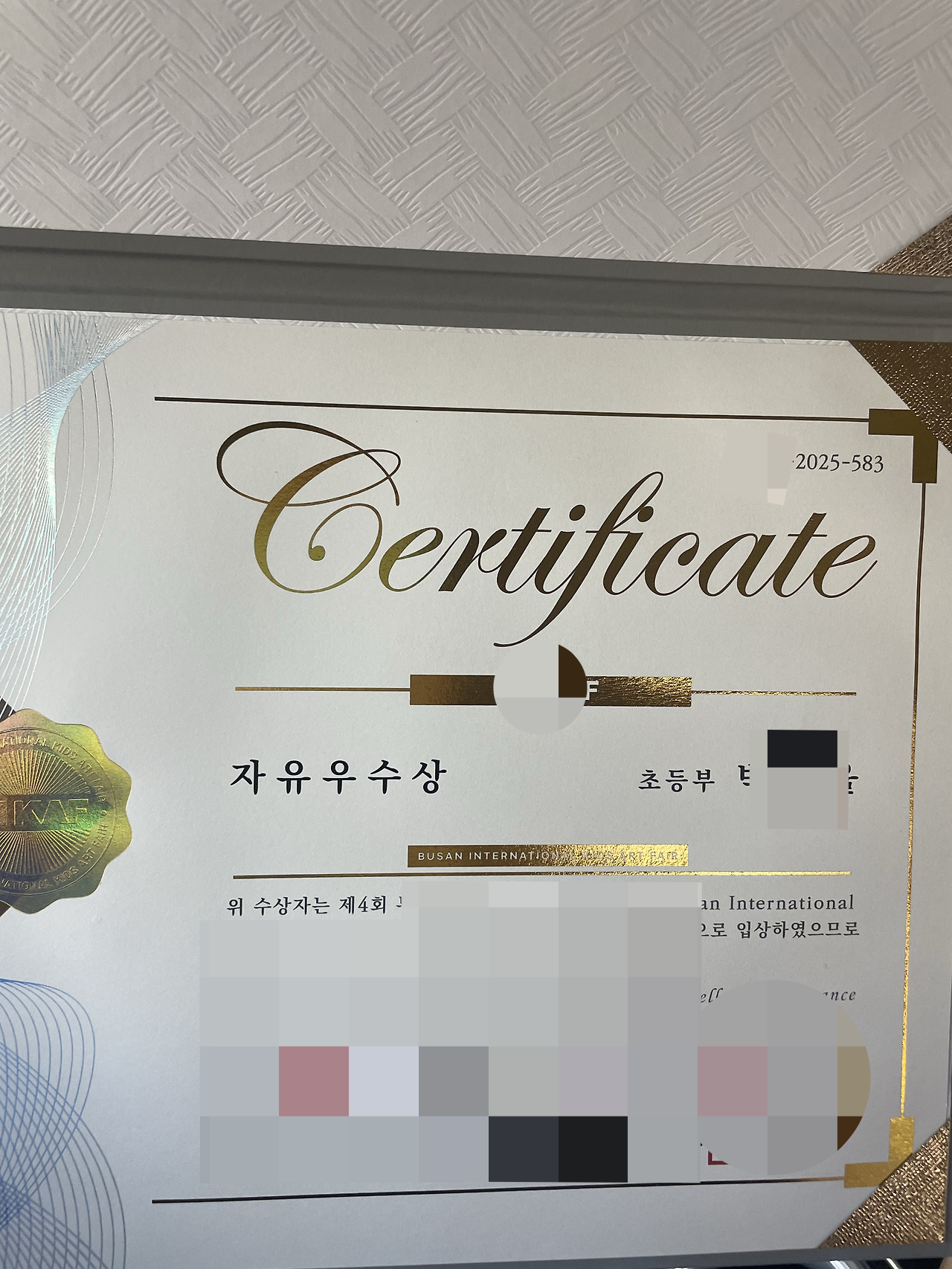 6개월 아이가 미술놀이 한 번 한다고 무슨 변화가 보이겠습니까. 그냥 몸에 좋다니 비타민 먹는 기분이죠. 다만 재료를 손에 묻히고 주무르는 과정을 온전히 즐기는 아이의 순수한 모습은 그 자체로 충만한 예술이었습니다. 시간이 흐르면서 아이가 소위 말하는 ‘예술적 재능‘을 타고나지 않았다는 것을 깨달았지만, 그것은 문제되지 않았습니다. 중요한 것은 아이가 여전히 미술을 좋아한다는 사실이었으니까요. 아이의 취미를 지켜주고 싶었기 때문에 초등학교에 가면서 자연스럽게 동네 미술학원에 등록하게 되었습니다. 이미 같은 학교 아이들이 많이 다니고 있는데다 홈페이지에 아이들이 받은 미술대회 상장이 가득 올라오는 학원이었습니다. 다니는 학생들이 미술대회에서 수상한다는 사실은 아이의 예술적 재능 유무를 떠나, 아이의 자존감을 높여주고 싶었던 제 마음을 정확히 파고들었습니다.