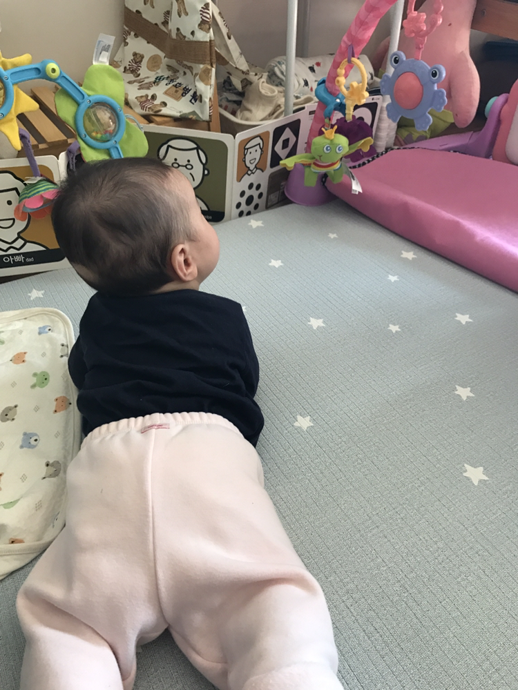 이 똑같은 일상 속에서, 아기의 뇌는 그 어떤 것보다 역동적으로 움직이는 것 같다. 그저께는 흑백 모빌에만 반응했었는데 어제부터는 갑자기 컬러 모빌을 보며 웃는다. 어제까지는 마치 소리지르는 것처럼 '액액'거리기만 했는데 오늘은 '오와에에', '으갸~' 같은 제대로 된 옹알이를 한다. 오늘 아침에는 모빌을 보며 휘적거리기만 했는데 오후가 되니 고리로 된 모빌을 손으로 잡는다. 내가 마치 어제를 복사한 것 같은 오늘을 보내는 사이 아기는 시시각각 엄청난 진보를 이뤄 낸다. 어쩌면 똑같은 하루를 보낸 것이 내겐 진보인지도 모른다며 마음을 달래 본다. 적어도 내 인내심이 진보한 건 확실하다.