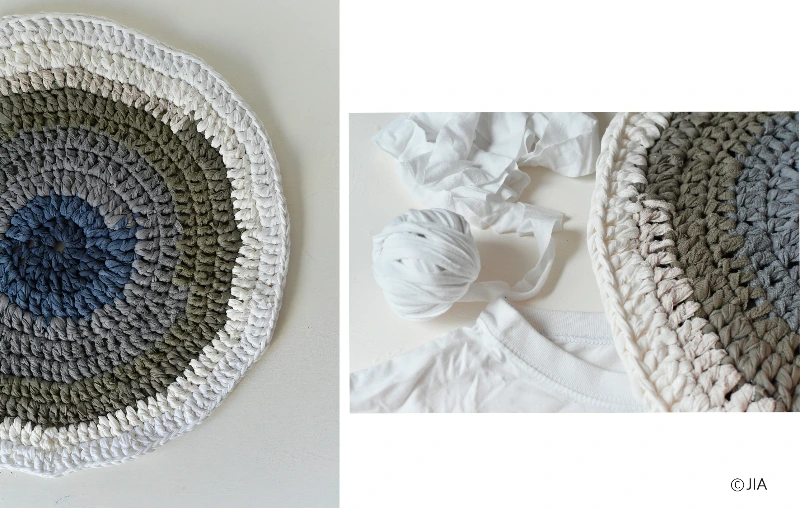 -티셔츠를 잘른 원단으로 실타래를 만든다.