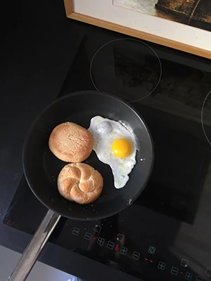 빵은 2 등분하여 팬을 달구는 동안 단면을 함께 달구어 준다. 싸고 탄력적인 소시지는 빵에 잘 올려지자 하는 의도로 반을 잘라주었다. 빵과 함께 달구어 진 팬에 올린다. 소시지가 적당히 제 등을 그을리면 밖으로 꺼내 주고, 고 자리에 계란을 톡 넣어준다. (계란 비린내가 거슬린다면 소금을 약간 넣어도 좋지만, 나는 계란이라면 날 것이라도 좋다.) 계란 톡과 동시에 빵 위에 체다 슬라이스를 한 장 잘라서 얹어주었다. 모든 것은 준비되었다. 이제는 아기 다리 고기 다리던 합체의 시간. 나는 나로 인해 행복할 때 진정으로 행복하다. 맛있음은 그 자체로 준비된 행복이니, 내가 만든 맛있음이란 행복을 넘어 만족의 경지로 간다.