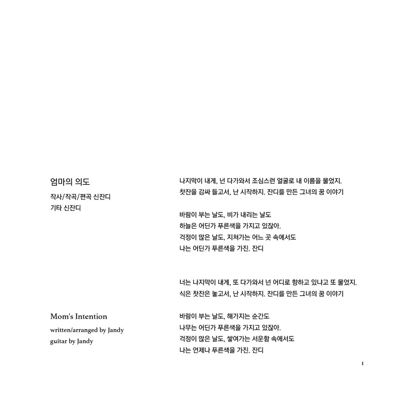 이런 마음으로 지은 노래가 '엄마의 의도' 이다. 울창한 캘리포니아 시골 한자락에 있는 오래되고 조용한 마을, 이모부가 매일매일매일 티브이 앞에 앉아계시고 이모는 이모부 귀에 대고 큰 소리로 잔소리를 하시는 바로 그 곳 거실에 앉아서 이 노래를 만들었다. 편곡과정을 거치며 많은 변화를 맞았지만, 그 날의 아늑함이 더 잘 표현된 것 같아서 만족한다. 나 이 곡 정말 오래동안 부르고 싶다. 누가 이름을 물을때, 차를 마실 때, 누군가의 거실에 앉아서. 오래동안 엄마의 의도를 말하고 싶다.
