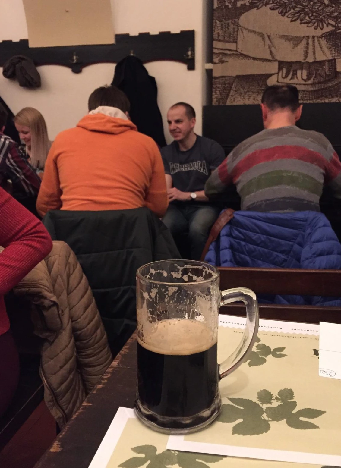 프라하에 도착하기 전부터 마킹해둔 펍이었지만 너무 좁은 그 공간에 너무 과도한 인원이 들어 차 있어서 번번이 실패했던 곳이다. 웬만하면 서 서든 어설프게 앉어서든 한 잔은 먹고 나오겠는데 그게 안 되는 초 고밀도에 인원이었다. 체류 두 달만에 평일 낮 5시쯤 (오픈 직후) 겨우 어디 구석에 끼여서 마셔봤다. 맥주 사진 찍는 건 고사하고 보후밀 형님 얼굴 사진 찍는 것도 정말 정신 차려서 찍은 것.