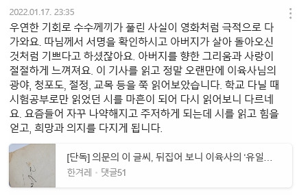 <읽는 인간 리터러시를 경험하라> 책에서 저자는 읽는 인간이란 스스로 읽으면서 자신의 생각과 삶의 방식에 관심 갖고 그 가치와 의미를 나날이 갱신해나가는 사람이라고 했다. 나는 ‘기사 정독하고 댓글 쓰기’가 나를 읽는 인간에 좀 더 가까워지게 할 수 있지 않을까 생각해본다.